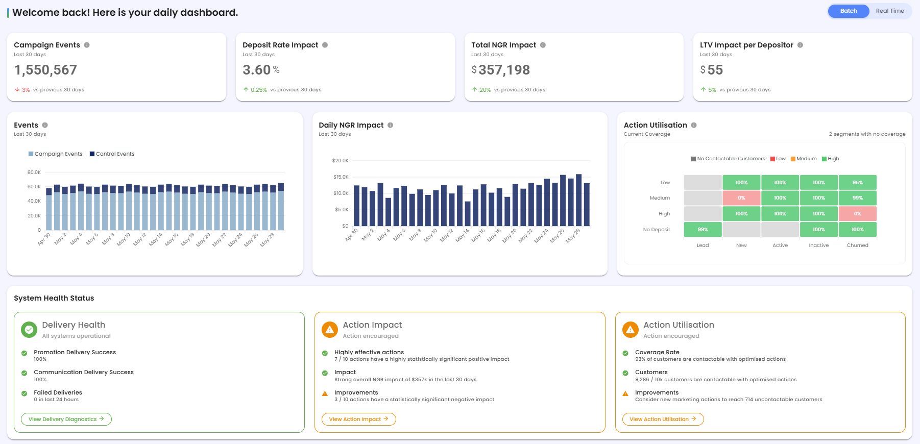 Real-time is where we respond instantly to customer triggers - surfacing live activity and enabling immediate awareness across marketing operations. It complements the batch view, giving users a broader spectrum of visibility: both deep strategic insight and moment-to-moment operational awareness.